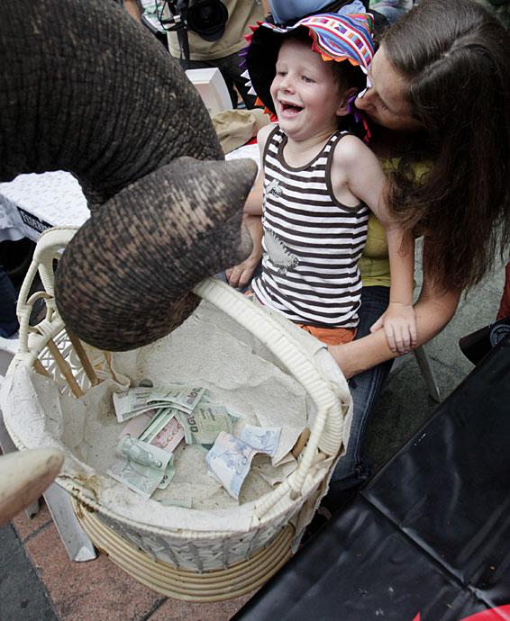 1月21日,在泰國首都曼谷舉辦了一場大象為海地災區募捐活動。人們紛紛向大象攜帶的籃子內放入善款,向海地地震幸存者獻上一份愛心。圖片來源:中國新聞網
