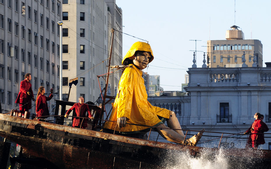近日,智利首都圣地亞哥街頭,法國一劇團攜巨型提線木偶“小巨人”上街表演,它惟妙惟肖的表情和逼真的神態引得周圍觀眾的陣陣掌聲。圖片來源:中國新聞網