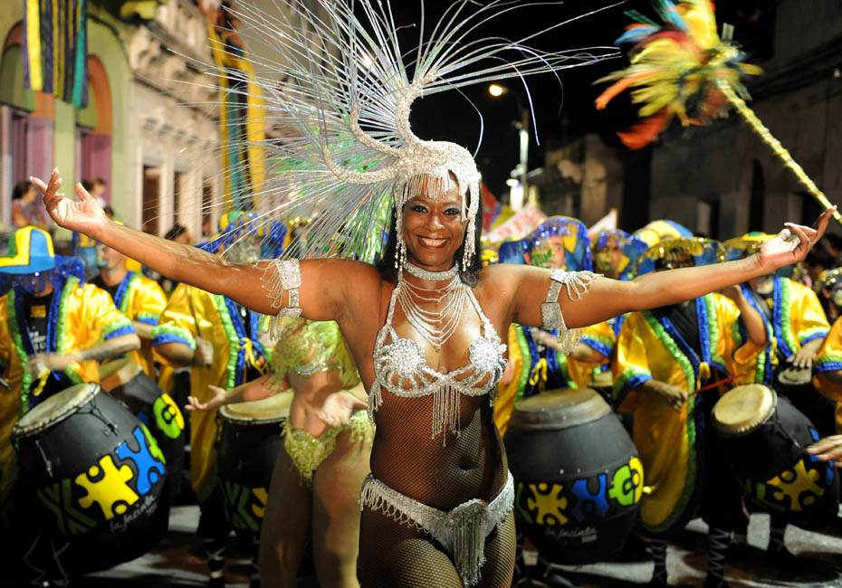 圖為演員們在烏拉圭首都蒙得維的亞參加狂歡節“召喚”巡游表演。