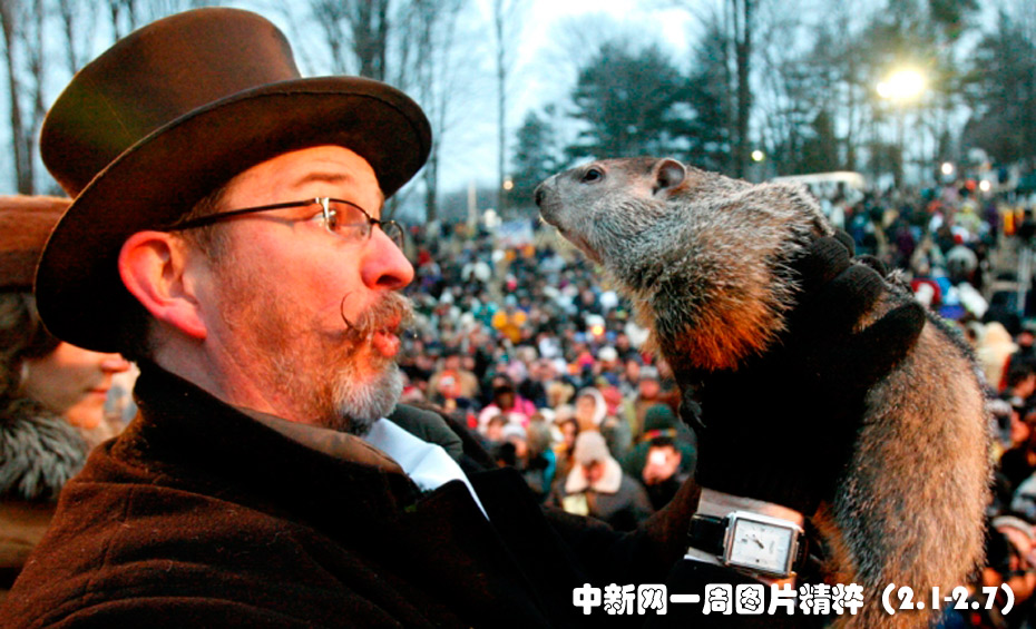 2月2日(周二),在美國賓夕法尼亞州的土撥鼠鎮(zhèn)(Punxsutawney),本休斯(Ben-Hughes)抱著從地洞里爬出的土撥鼠菲爾,據(jù)說菲爾“看見”了自己的影子。根據(jù)傳統(tǒng),如果菲爾能看見自己的影子那就意味著冬季還要再延續(xù)六周。圖片來源:中國新聞網(wǎng)