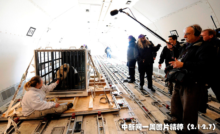 2月4日(周四),大熊貓泰山被送上貨機,從美國佛吉尼亞州尚蒂爾市啟程返回中國。圖為飼養員妮可.-米斯(Nicole-Meese)在機艙里為泰山喂食。圖片來源:中國新聞網