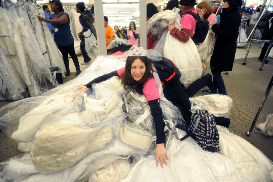 近日,美國(guó)紐約一年一度的“新娘快跑”婚紗促銷(xiāo)活動(dòng)舉行。千余名來(lái)自全美各地的準(zhǔn)新娘和親朋好友,早早就在門(mén)口等候,平時(shí)上千美元婚紗只需要五分之一的價(jià)格就能帶回家。圖片來(lái)源:中國(guó)新聞網(wǎng)