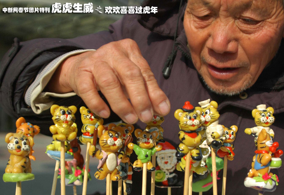 2009年12月5日,民間藝人孟爾珍在整理捏制的面“虎”。虎年即將來臨,74歲的江蘇揚州民間面塑藝人孟爾珍捏制出許多神態(tài)各異的面“虎”臨街售賣。這種由面粉、香油、蜂蜜、甘油等近十種配料做成的面“虎”,深受孩子和年輕人的喜愛。 中新社發(fā) 張丙濤 攝