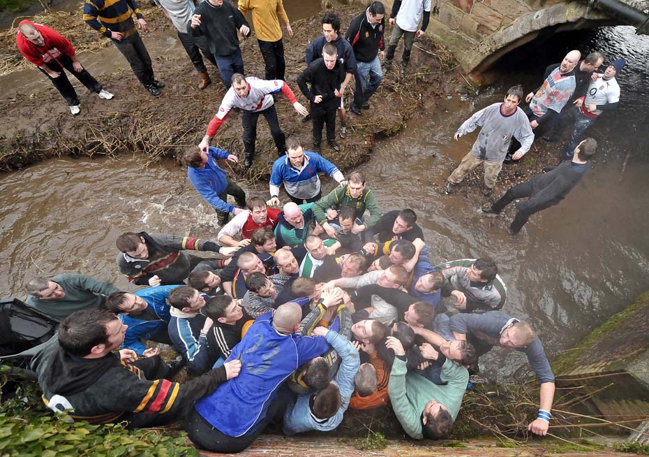 2月16日,英國阿什本的小鎮舉辦懺悔節,每年舉辦懺悔節足球賽是一項古老的傳統,有數百年的歷史,最早的文字記錄是1683年。圖片來源:中國新聞網