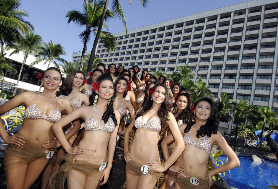 2月18日,在菲律賓首都馬尼拉,參加2010年菲律賓小姐競選的選手們在展示泳裝。當日,共有24名佳麗參加了這項比賽。圖片來源:中國新聞網