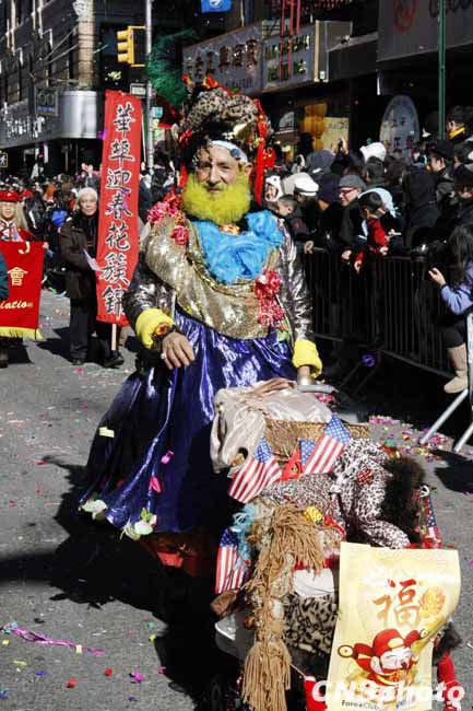 虎年紐約華埠慶祝農歷新年“重頭戲”花車大游行21日登場,吸引超過10萬人圍觀共同狂歡,成為歷年來參加人數最多的一次花車游行。12輛盛裝花車以及數千人的表演團隊沿著華埠最熱鬧的數十條街道一邊行進一邊表演,滿天彩帶飄揚,場面熱鬧非常。圖為游行隊伍中奇裝異服的美國人。