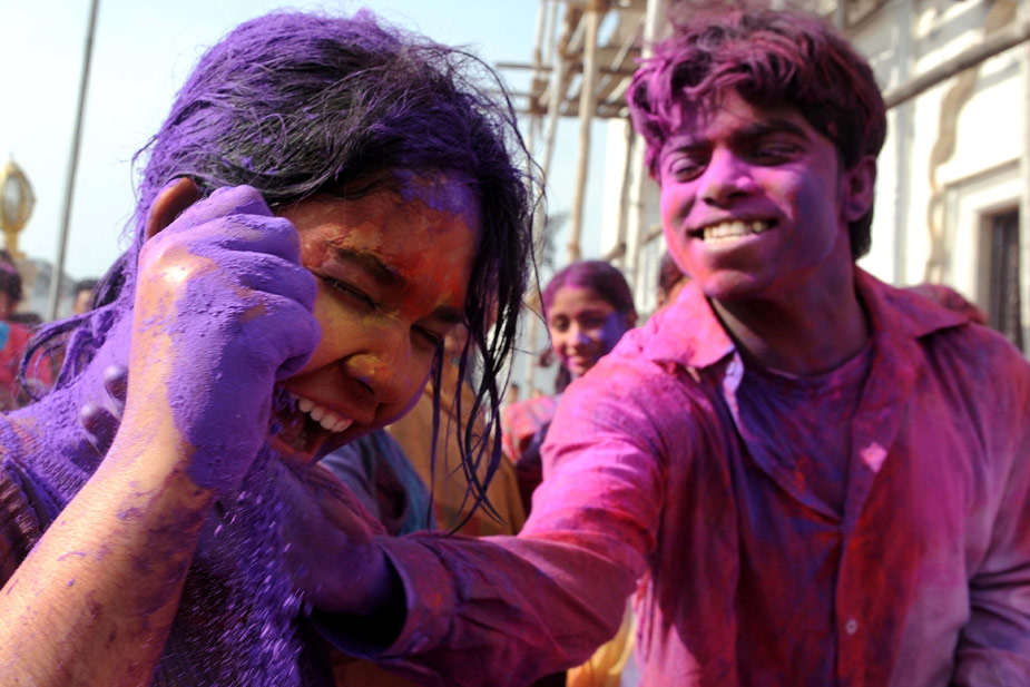 2月28日,印度舉行慶祝灑紅節活動,人們互撒顏料以示祝福。 灑紅節是印度最盛大的節日之一,在每年2月至3月間舉行。按照傳統習俗,人們會在自己的臉上和身上涂抹顏料,還向別人身上拋撒彩色顏料和粉末。