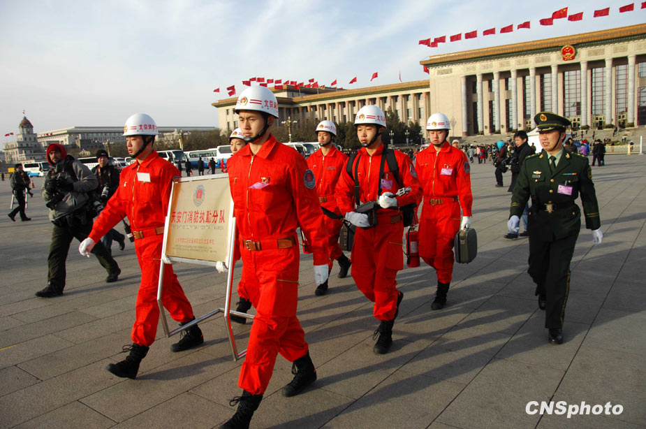3月5日上午9時,十一屆全國人大三次會議在北京隆重開幕。國務院總理溫家寶作政府工作報告。圖為武警消防官兵提前進入天安門廣場,保障會議安全。中新社發 柯小軍 攝