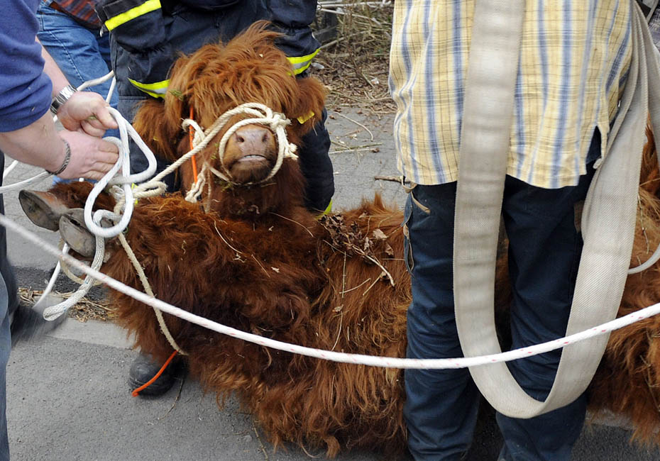 3月18日,德國一頭蘇格蘭高地牛來到一居民院內懶洋洋的曬太陽,最后經過獸醫的麻醉和消防員協力才將這頭蠻力十足的家伙“制服”。圖片來源:中國新聞網