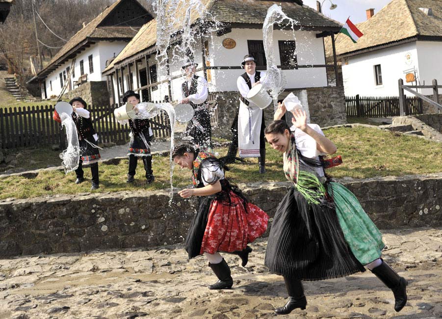 3月26日,在匈牙利首都布達佩斯以東被譽為世界文化遺產的霍洛克村,當地居民以向姑娘身上潑水的傳統儀式慶祝復活節。此項古老習俗起源于公元2世紀。