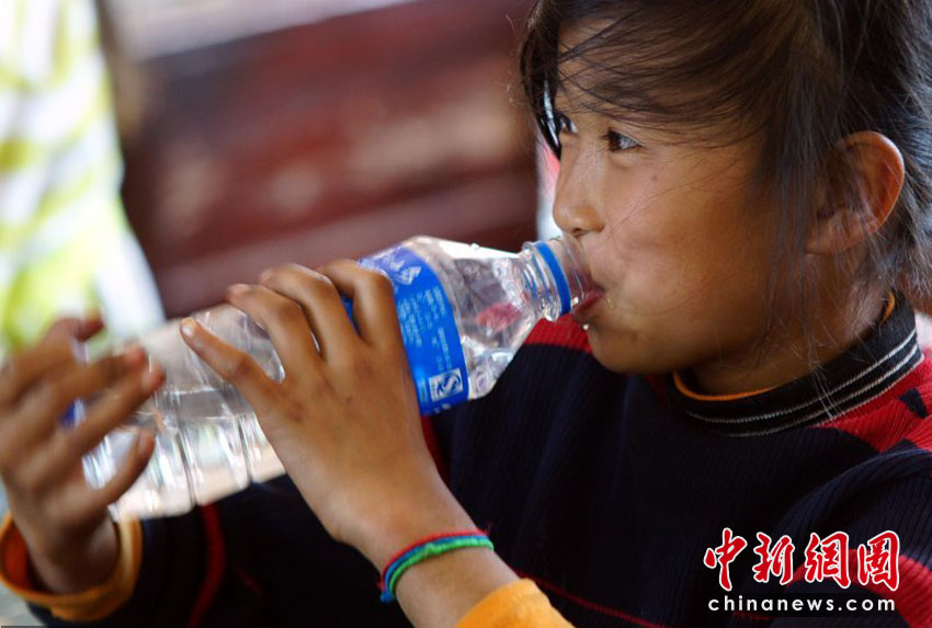 上課時,孩子們喝在桌子上放著的礦泉水,現在他們每天發兩瓶水,很多孩子省下來一半帶回家給家人。沙浪 攝