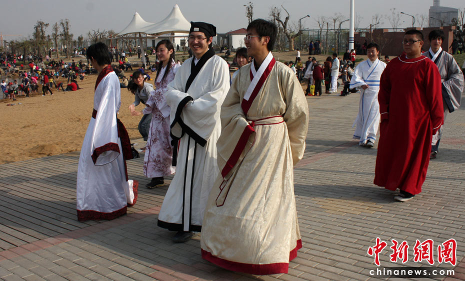 4日,通過網絡結交崇尚漢文化的青年網友相約在棗莊東湖公園,一起切磋漢文化。當日,通過網絡結交崇尚漢文化的14名青年網友,利用清明小長假相約在山東省棗莊東湖公園,身著漢服踏青交友,感受漢文化。中新社發 吉 喆 攝