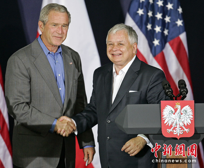 波蘭總統卡欽斯基乘坐的一架圖-154飛機10日在俄羅斯斯摩棱斯克州北部一軍用機場降落時失事,至少87人死亡。卡欽斯基本人被確認身亡。圖為2007年波蘭總統卡欽斯基與美國前總統小布什。