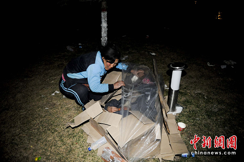 圖為4月15日凌晨,青海玉樹地震受災民眾在露天睡覺,由于救災物資匱乏有的民眾只得以塑料薄膜當棉被御寒。中新社發 廖攀 攝