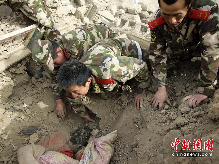 圖為4月14日11時,武警玉樹支隊的戰士在玉樹縣結古鎮地震廢墟里救助被困民眾。中新社發 張守國 攝