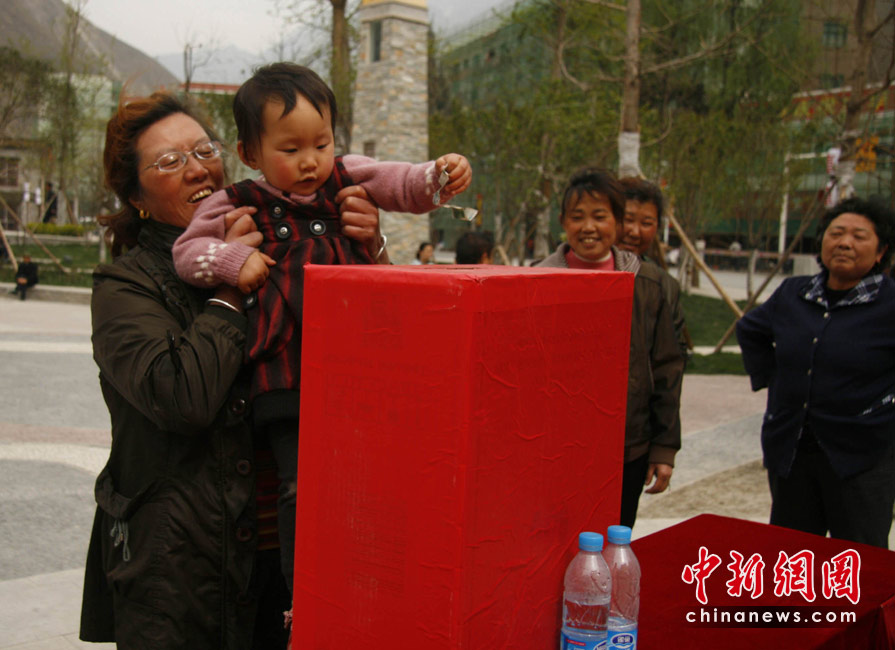 4月15日,汶川發動各方力量向青海玉樹災區籌集善款,汶川縣政府向村級以上單位發出捐款通知,在汶川縣鍋莊廣場啟動,汶川紅十字會在當天就籌得善款5萬余元。中新社發 汶川宣傳部 供