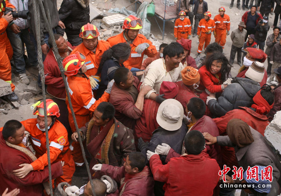 2010年4月16日13:50分左右,青海省玉樹藏族自治州玉樹縣地震發生第三天,在中心城區一垮塌賓館現場一名被埋54小時13歲的才珍拉姆被國家地震局應急救援隊等成功救出。4月14日07時49分許,青海省玉樹藏族自治州玉樹縣(北緯33.1,東經96.7)發生7.1級地震。中新社發 劉忠俊 攝