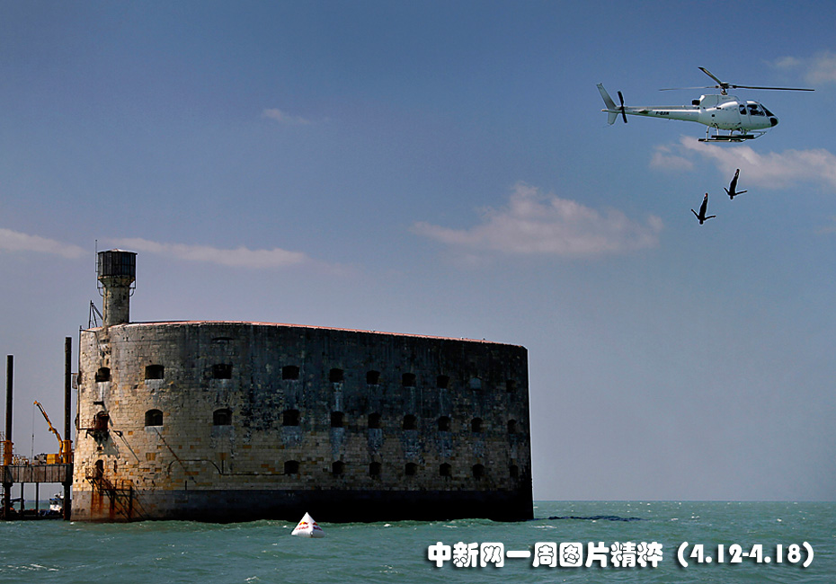 4月12日周一,在法國拉羅謝爾海岸的博涯堡壘附近,從一架直升機上跳入水中,他們正在為將于下月開始的紅牛懸崖跳水世界系列賽進行訓練。