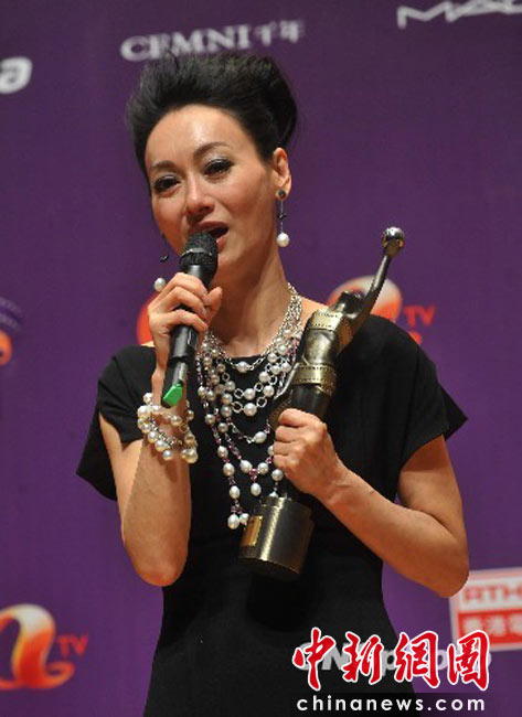 4月18日晚,“第二十九屆香港電影金像獎”頒獎典禮在香港文化中心大劇院隆重舉行,影星惠英紅憑演出電影“心魔”奪得最佳女主角獎項。圖為惠英紅手持獎座向媒體暢談感受。 中新社發 鄧慶樂 攝