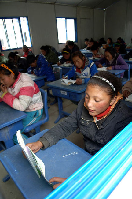 4月18日,70多名孩子在地震四天后重新走進了課堂,玉樹州孤兒學校成為了地震災區第一所復課的學校,剛完成帳篷搭建的青海省玉樹藏族自治州第一民族中學3個年級的學生也開始復課。圖片來源:新華網