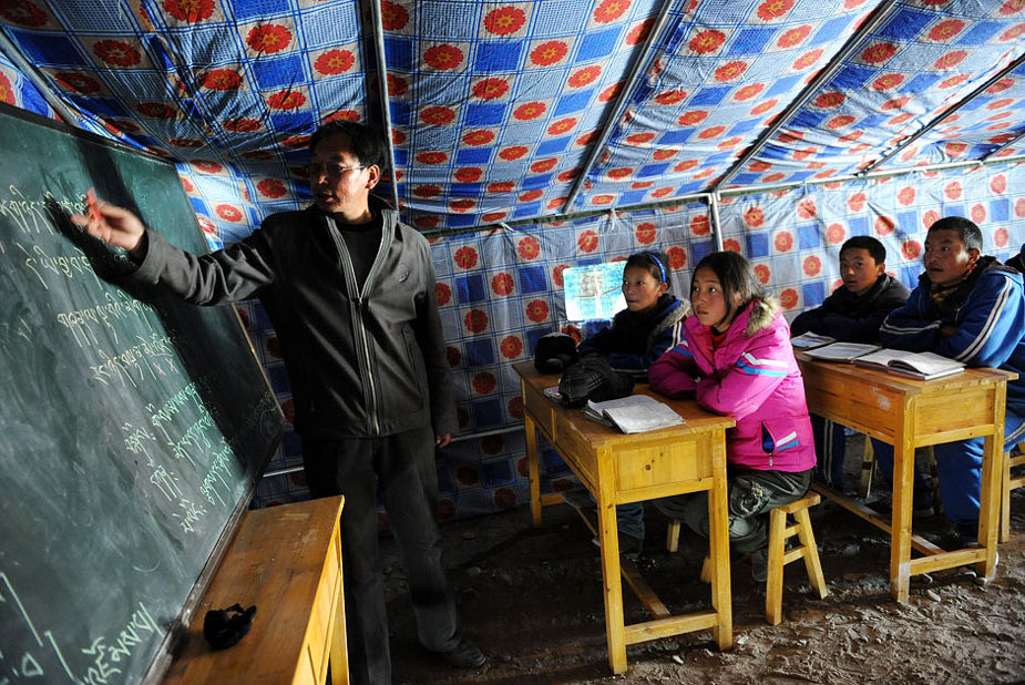4月18日,70多名孩子在地震四天后重新走進了課堂,玉樹州孤兒學校成為了地震災區第一所復課的學校,剛完成帳篷搭建的青海省玉樹藏族自治州第一民族中學3個年級的學生也開始復課。圖為4月18日,玉樹藏族自治州第一民族中學八年級老師次成尼瑪(左一)在帳篷教室內給學生上課。 圖片來源:新華網
