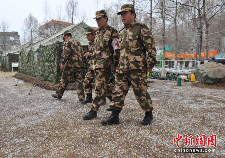 4月20日12時許,玉樹地震災區突然雷雹交加,青海武警總隊醫療救護隊帳篷前一片雪白,軍醫立刻商量救護對策。中新社發 賈國榮 攝