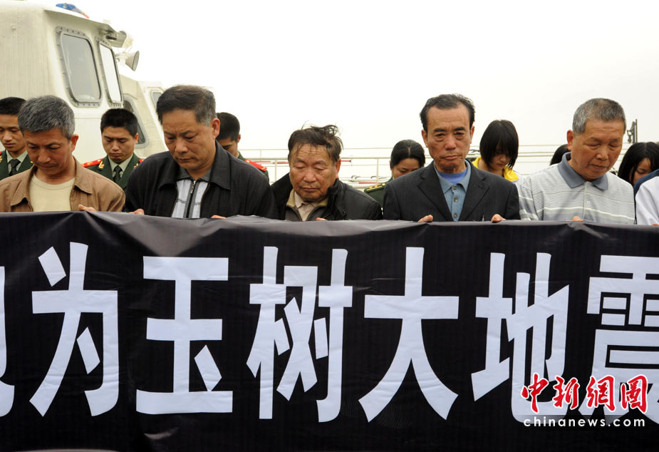 4月21日上午,福州邊防支隊馬尾大隊公邊艇警笛長鳴,百余名邊防官兵與駐地閩安中學師生、僑胞、臺胞手持黃菊花、胸戴小白花,肅立默哀3分鐘,以表達對青海省玉樹縣地震遇難同胞的深切哀悼。圖為參加該悼念儀式的福建僑胞臺胞手舉橫幅向玉樹地震遇難者默哀。中新社發 劉可耕 攝