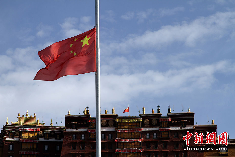 4月21日,西藏布達拉宮廣場上舉行降半旗儀式。同時,布達拉宮紅宮頂端的紅旗也降半旗,向青海玉樹地震遇難者志哀。中新社發 徐長安 攝