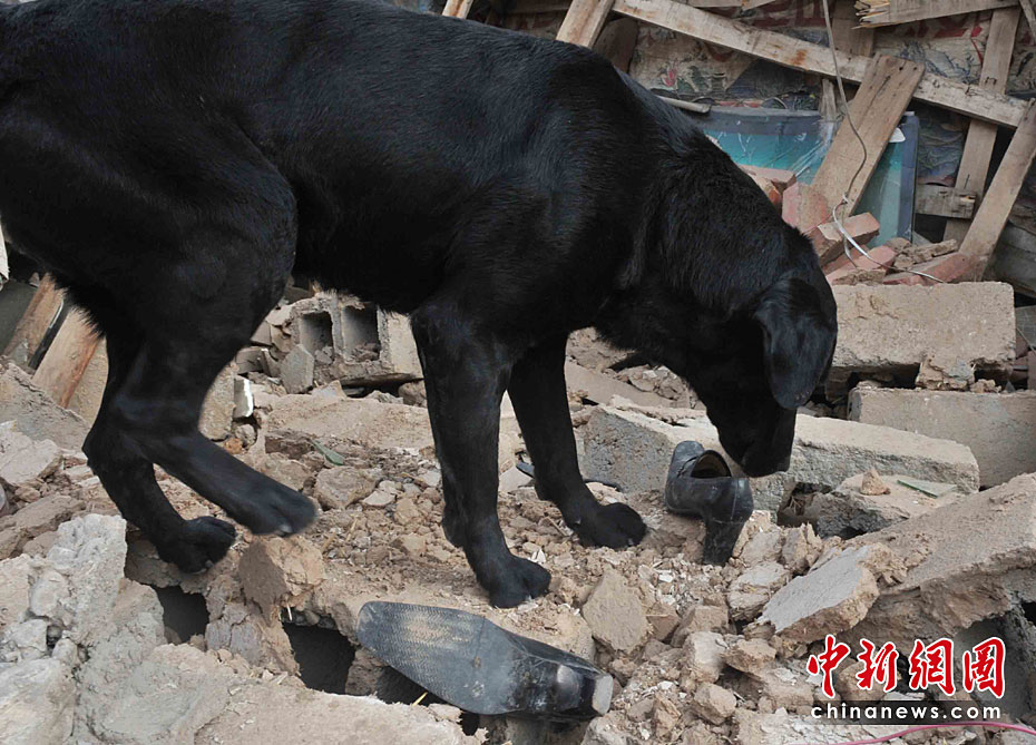 名貴的黑貝犬是中國國家救援隊趕赴青海玉樹地震災(zāi)區(qū)6只搜救犬隊成員之一,身價近百萬元人民幣。4月21日清晨八時許,它在救援隊員的帶領(lǐng)下,到玉樹地震災(zāi)區(qū)中心商業(yè)街廢墟里,四處奔波,盡職盡力尋找生命跡象。10時后,他和救援隊員都出現(xiàn)高原反應(yīng),暫時休整,準備再戰(zhàn)。賈國榮 攝