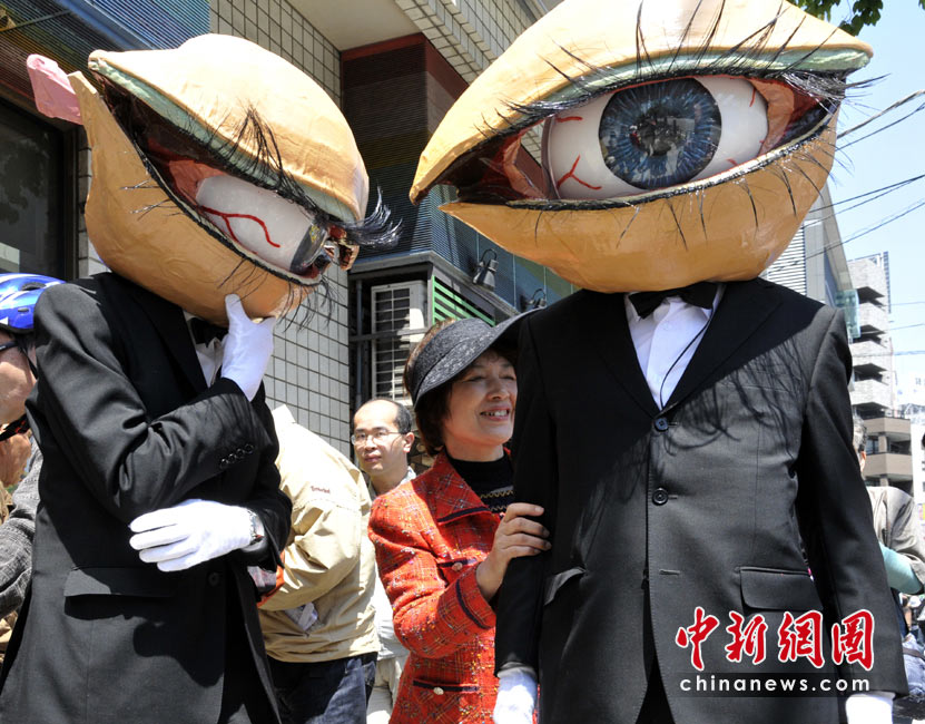 4月26日,日本一個表演藝術團體扮成“獨眼怪人”在街頭亮相,大玩行為藝術。