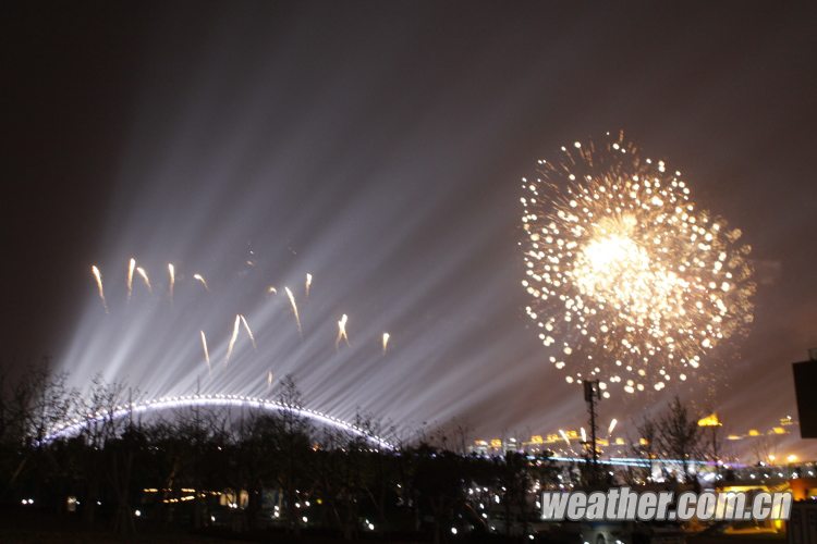 2010年4月27日,上海世博會開幕式彩排順利進行。圖為燈光與煙花互相映襯,十分絢麗。卞赟 攝