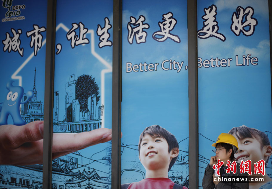 4月29日,上海一名建筑工人站在世博會宣傳海報前。世博會開幕在即,面臨“大考”的上海充滿喜慶氣氛。中新社發(fā) 盛佳鵬 攝