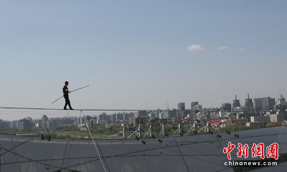 4月29日,有高空王子之稱的新疆小伙阿迪力在鳥巢上空成功試演達瓦孜(高空走鋼絲)。5月3日起,他將在北京國家體育場(鳥巢)頂棚上搭建的小屋生存60天,其間每天將進行約5個小時的高空走鋼絲表演。 中新社發 蘇丹 攝