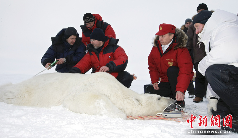 4月29日,俄羅斯總理普京參觀亞歷山大地島(法蘭士約瑟夫地群島)。 普京還與在研究學(xué)者一同給通過(guò)專門的陷阱捕獲的北極熊戴上衛(wèi)星定位項(xiàng)圈。此外,學(xué)者們還與普京一起給北極熊進(jìn)行測(cè)量和秤體重,