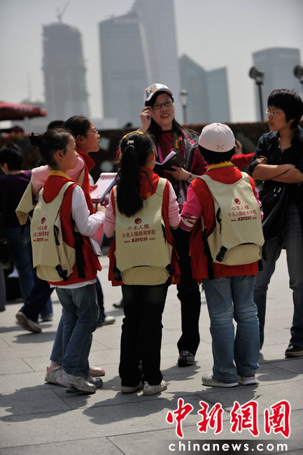 30日上午,記者在上海外灘采訪時遇到小主人報新聞學校的“小記者”們在采訪,成為他們今天的第一個采訪對象!靶∮浾摺眰冏铌P心的問題是關于世博會,“如何讓世界變得更美好”。她們都表示非常想去看世博會,最想看的是中國館,但是要留到最后看,“因為其它館都會拆掉,中國館會保留下來”。“小記者”們說,自己要從身邊小事做起,做有文明有素質的人,并表示希望自己將來成為真正的“大記者”,更好地報道上海。吳歆/文 王紅綱/圖