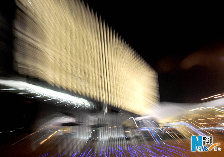 夜色下的世博園,迷離而夢幻。圖為媒體中心。圖片來源:新華網 郭毅攝