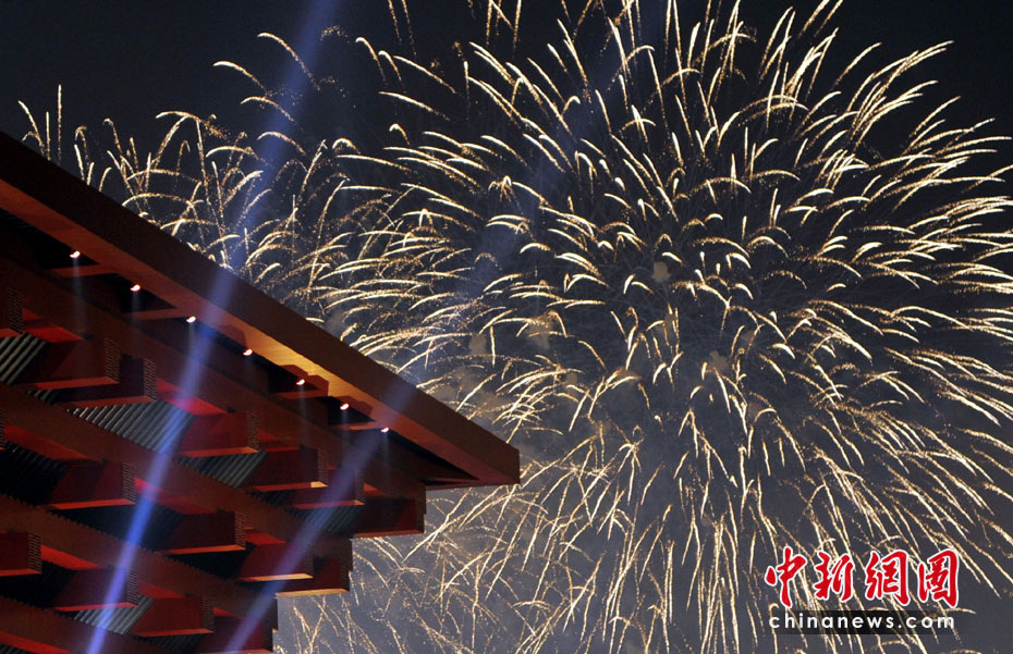 4月30日晚,2010年上海世博會開幕式在上海世博園世博文化中心舉行。21時(shí)28分,世博會焰火燈光表演開始。黃浦江兩岸綿延3.28公里同時(shí)奏響火樹銀花不夜天的華彩世博樂章。中新網(wǎng)記者 王紅綱 攝