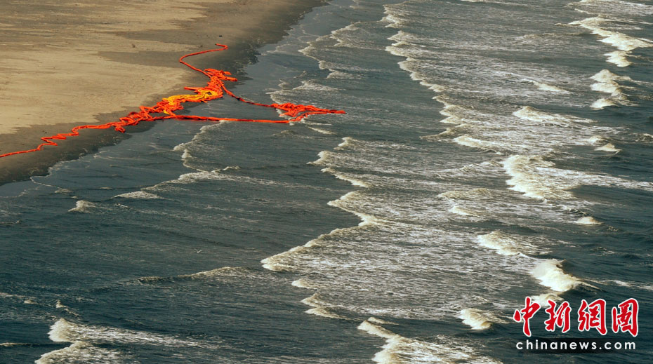 4月30日,在美國路易斯安那州海岸,為阻隔原油擴散而設的護欄帶被海風浪沖到岸邊。當天,美國總統(tǒng)奧巴馬下令調查墨西哥灣石油鉆井平臺爆炸事件,以避免將來類似事件再次發(fā)生。平臺爆炸沉沒后泄漏的原油當天已漂至美國沿岸。圖片來源:中國新聞網(wǎng)