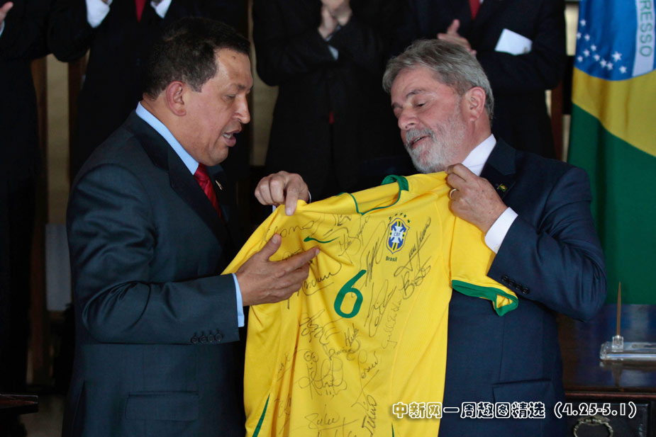 4月28日,巴西總統(tǒng)盧拉在巴西利亞伊塔馬拉蒂宮向來訪的委內(nèi)瑞拉總統(tǒng)查韋斯贈(zèng)送由巴西球星簽名的球衣。圖片來源:中國(guó)新聞網(wǎng)>>點(diǎn)擊觀看詳細(xì)內(nèi)容