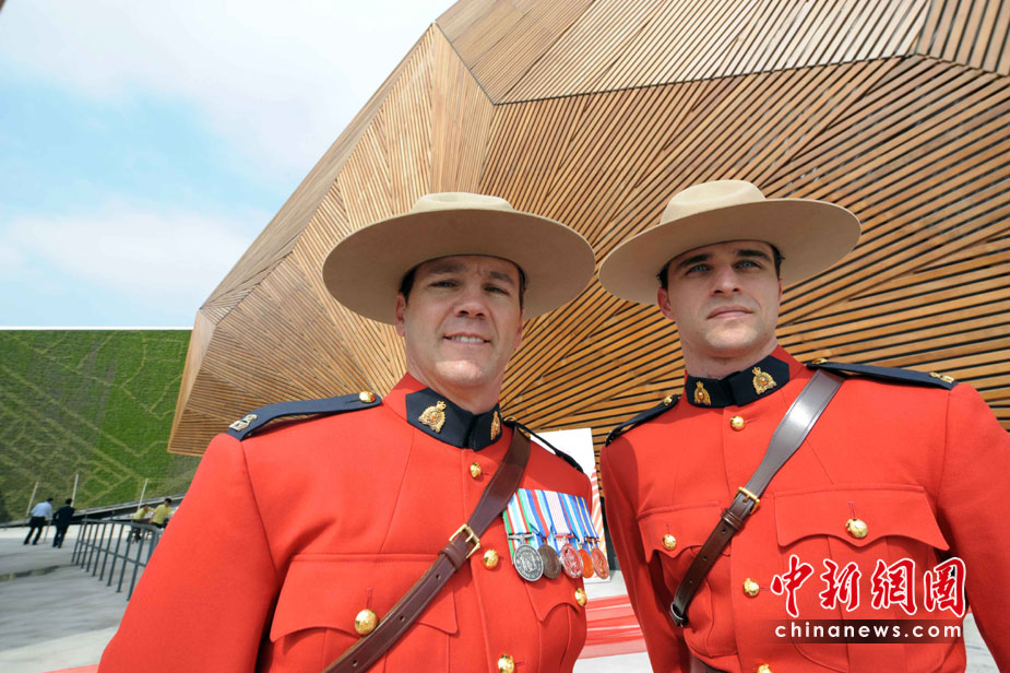 5月1日,上海世博會開幕第一天,兩名加拿大騎警在加拿大館前亮相,加拿大館于當(dāng)日上午開館。中新社發(fā) 陳文 攝