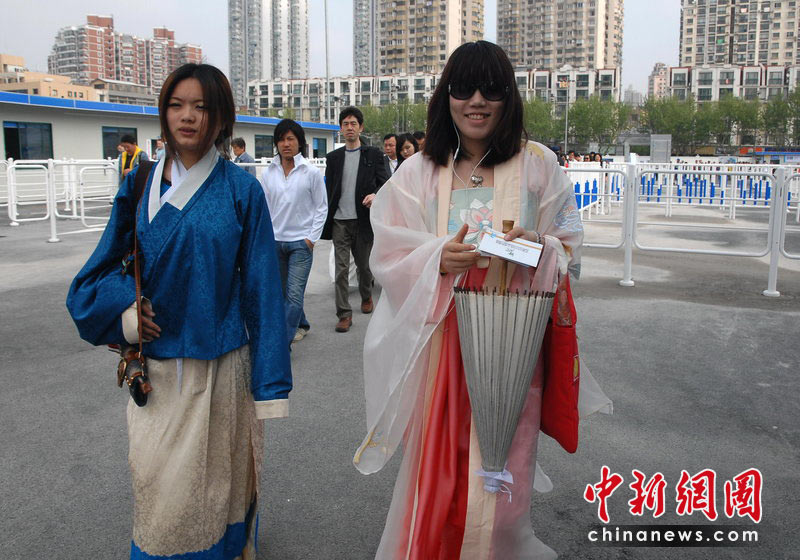 5月1日,上海世博會正式開園迎客,首批游客入園參觀。來自浙江大學城市學院的大學生,特地穿上漢服觀看中國上海2010年世博會。徐和德 攝