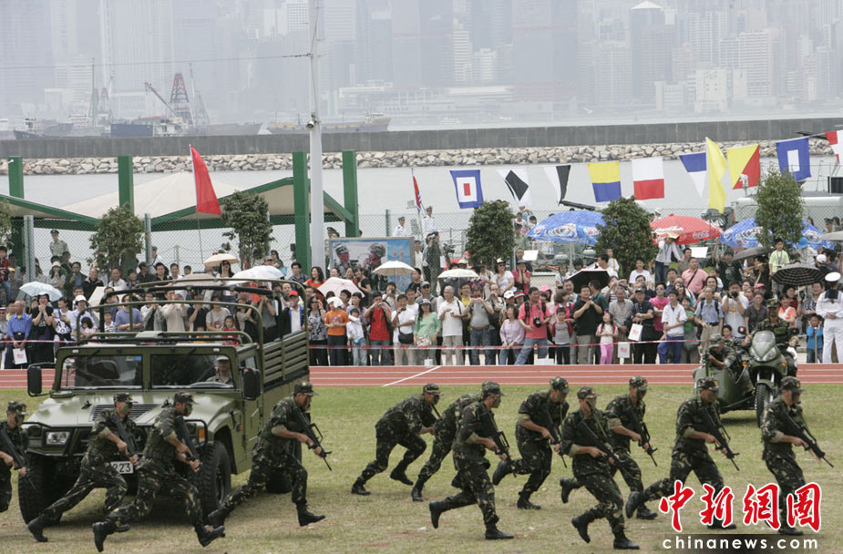 為慶祝“五一”國際勞動節,進一步增進與香港社會各界相互溝通與交流,中國人民解放軍駐香港部隊5月1日開放了昂船洲軍營,圖為“獵人戰斗”表演。中新社發 張勤 攝