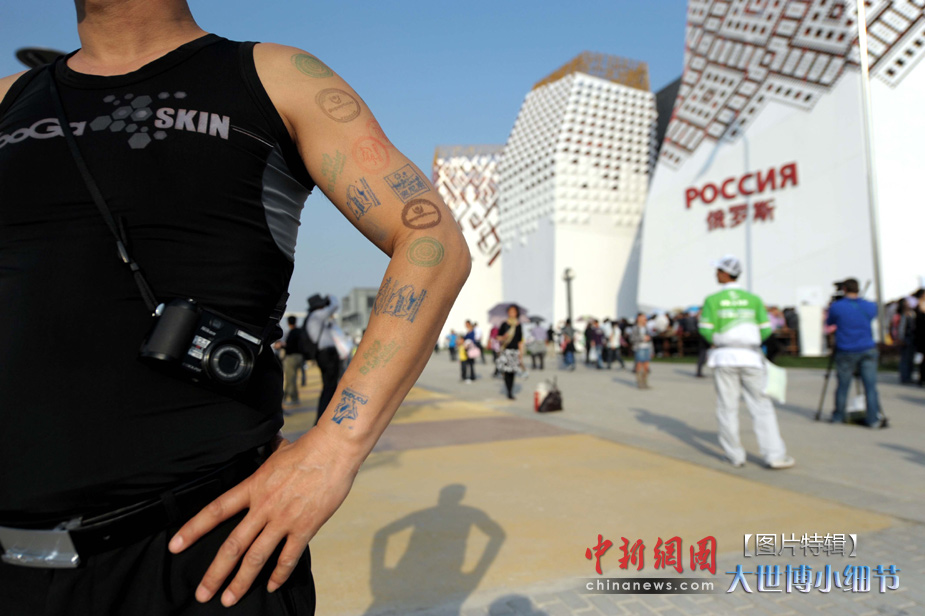 5月1日,上海世博會正式開園,當日有20萬人次的游客參觀了世博園。世博首日,許許多多的小細節都帶給人一種全新的體驗。圖為一男子胳膊上蓋滿世博園多個展館通行紀念印章,收獲頗豐。中新社發 陳文 攝
