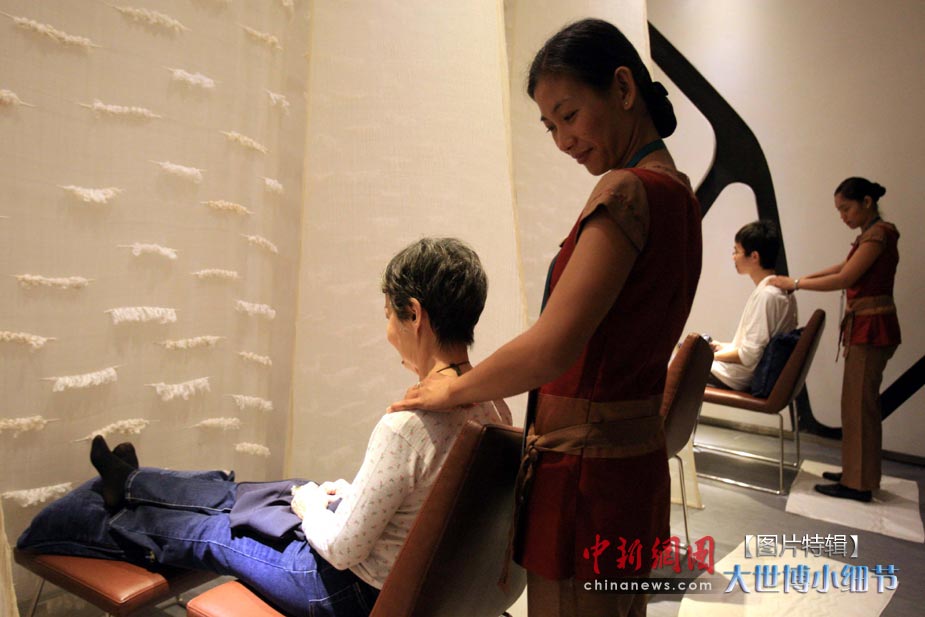 5月1日,上海世博會正式開園,當(dāng)日有20萬人次的游客參觀了世博園。世博首日,許許多多的小細(xì)節(jié)都帶給人一種全新的體驗。圖為菲律賓館的傳統(tǒng)按摩。中新社發(fā) 潘索菲 攝