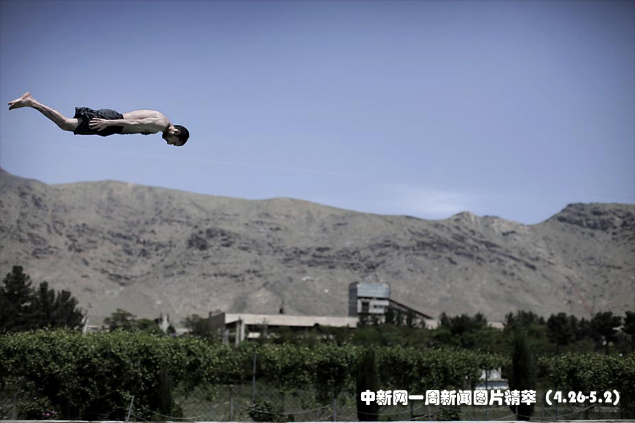 28日(周三),一名阿富汗男子在游泳池上進(jìn)行跳水,享受陽光。