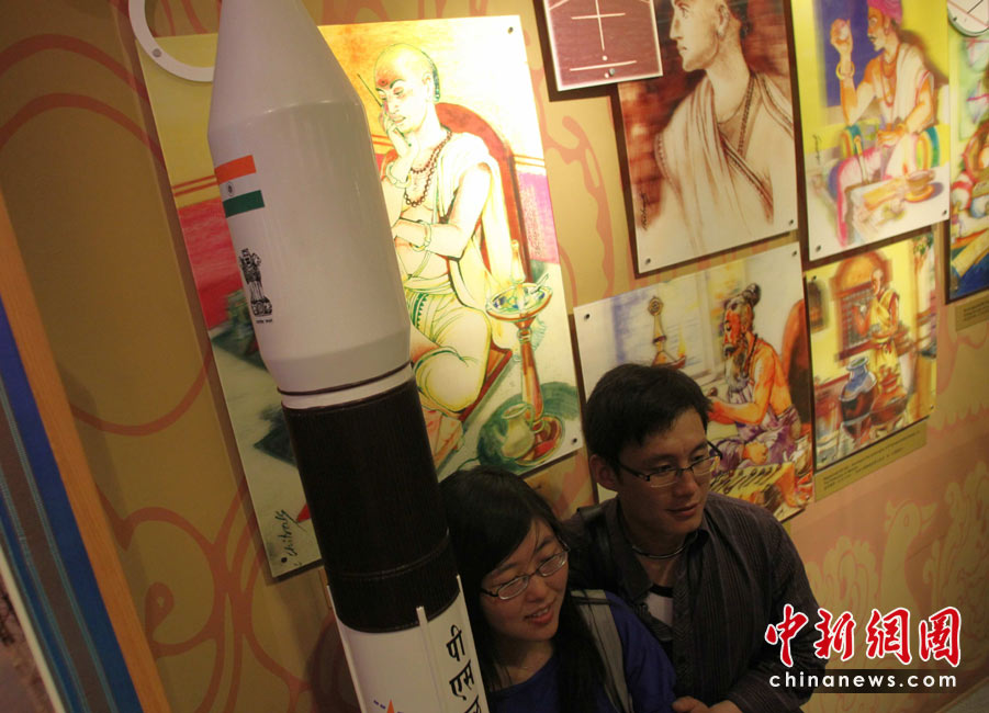 5月2日,觀眾在上海世博會印度館參觀印度的“一箭十星”火箭模型。中新社發(fā) 蘇丹 攝