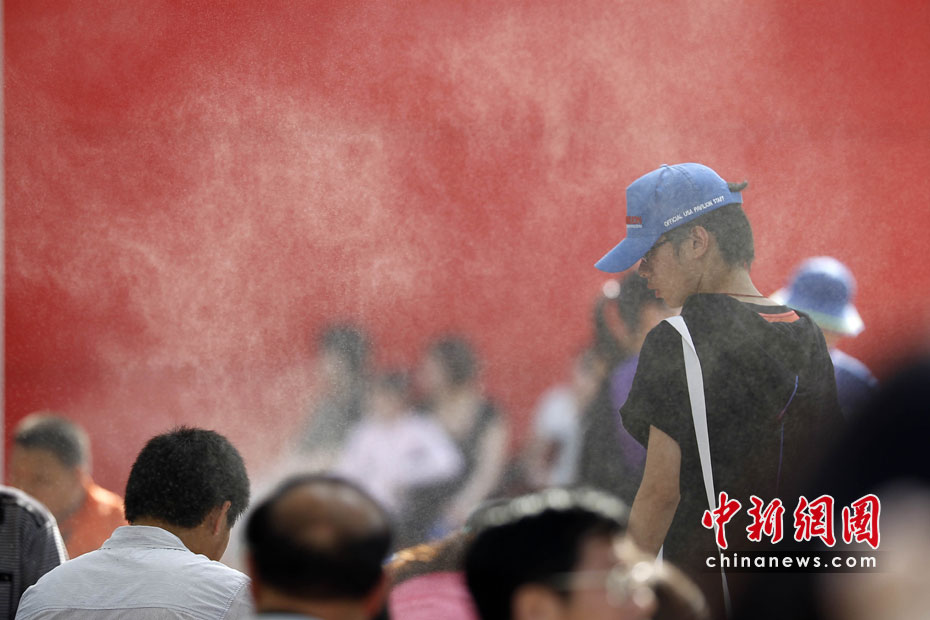 2010年5月2日,上海世博園區啟動各項控溫降溫設施應對高溫。圖為游客休息區內啟動噴霧降溫系統。中新社記者 盛佳鵬 攝