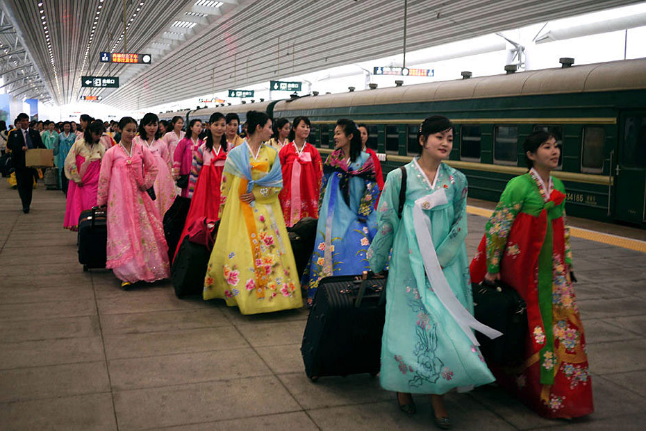 5月2日,載著198名朝鮮紅樓夢(mèng)劇組演員的專列駛?cè)氲|口岸。由朝鮮國(guó)家級(jí)藝術(shù)團(tuán)-血海歌劇團(tuán)創(chuàng)作的歌舞劇《紅樓夢(mèng)》將于5月6日至9日登陸北京電視臺(tái)大劇院,這個(gè)超大演員陣容亦創(chuàng)下近年來(lái)華國(guó)外演出人數(shù)之最。圖片來(lái)源:新華網(wǎng)
