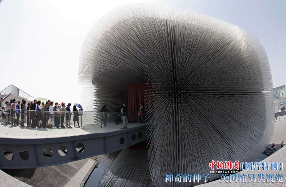 上海世博園開園才數日,自號“種子圣殿”的英國館已成人氣最旺場館之一。該館由6萬根亞克力桿巧妙構成,隨風搖動,頗為新奇。其每根桿子里都含有植物種子。中新社記者 盛佳鵬 攝