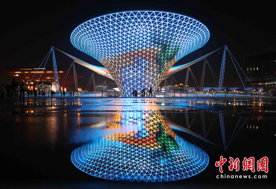 夜幕下的上海世博園區處處流露光華與璀璨,世博軸上的“陽光谷”成為一個個流光溢彩的“夜光杯”,以不同色調交織成流動的光影旋律,給游客們帶來難以忘懷的感受。中新社發 宗金柱 攝